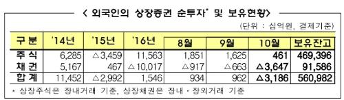 10월말 현재 외국인은 상장주식 469조4000억원(전체 시가총액의 31.1%), 상장채권 91조6000억원(5.7%) 등 총 561조원의 상장증권을 보유했다.