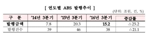 금융감독원이 8일 발표한 ‘2016년 3분기 ABS 발행실적’ 자료에 따르면 3분기 ABS 발행총액은 15조2000억원으로 전년동기 20조3000억원에 비해 5조1000억원(25.2%) 감소했다.