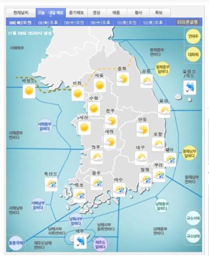 8일 예상강수량은 제주도, 울릉도·독도 5~20mm, 강원영동, 충청도, 남부지방 5~10mm로 나타났다.