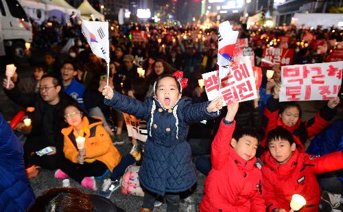 지난 12일 오후 서울 종로구 광화문광장에서 태극기를 든 어린이가 '최순실 게이트' 진상규명과 박근혜 대통령 퇴진 촉구 3차 촛불집회에 참석해 구호를 외치고 있다. 사진/뉴시스