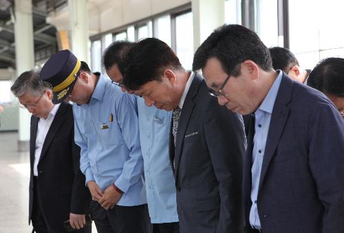 지난 8월25일 서울메트로 사장으로 임명된 김태호 사장이 구의역 사고 현장을 방문해 사고 희생자를 추모하는 묵념을 하고 있다. 사진/뉴시스