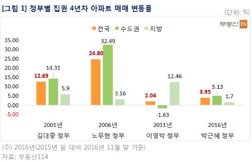 현 박근혜 정부도 집권 4년차인 올해 전국 아파트값이 3.95% 올랐다. 정부 출범 이후 담보인정비율(LTV)·총부채상환비율(DTI) 완화, 재건축 가능연한 단축, 분양권 전매 제한기간 단축 등 규제가 완화되면서 전국 아파트 매매가격은 지난 2014년(2.72%) 이후 상승세로 돌아서 올해까지 3년 연속 오름세가 이어졌다.
