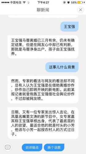 바이두의 채팅뉴스는 한 단계 더 진화했다. 스마트 옵션으로 독자가 궁금한 뉴스에 대해 질문을 하면 채팅 형식으로 답을 얻을 수 있다. 뉴스 플랫폼은 수 많은 정보 중 독자가 필요로 하는 내용만을 정리해 결과로 보여준다. 포털사이트에서 키워드를 입력해 찾는 것보다 훨씬 간편하다. 바이두의 자연어 처리부서의 엔지니어는 "바이두의 인공지능 시스템이 뉴스 정보를 분류하고 구조를 분석해 정보의 특징을 학습하는 방법으로 독자에게 핵심 정보만을 제공한다"고 서비스의 원리를 설명했다. 사람의 사고 방식을 그대로 모방했다는 것이다.