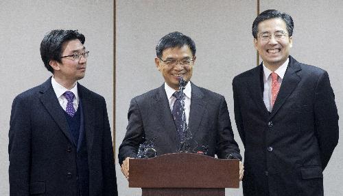 박근혜 대통령 탄핵소추의결서에 대한 답변서 제출 시한 마감날인 16일 오후 서울 종로구 헌법재판소 2층 브리핑 룸에서 열린 기자회견에서 답변서를 민원실에 제출한 박근혜 대통령 변호인단이 기자회견을 하고 있다. 사진/뉴시스