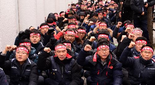 전국금융산업노동조합이 정부서울청사 앞에서 '쉬운 해고로 이어지는 성과연봉제' 원천무효와 함께 금융위원장 사퇴를 촉구하고 있다. 사진/뉴시스