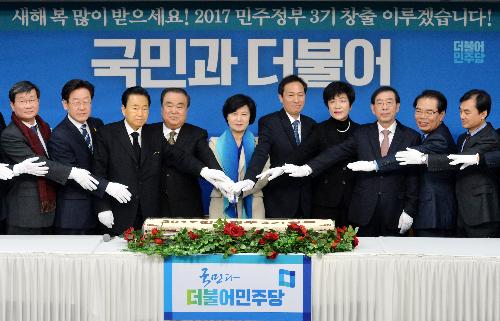 실제로 이날 민주당 신년 인사회에 참석한 인사 가운데 현역 의원 또는 당직자가 아닌 사람은 이 시장과 박원순 서울시장 둘 뿐이었다. 둘 다 대선주자로 분류된다. 인사회에서 '2017년 민주정부 3기 창출'이라고 적힌 인사 떡을 자를 때도 그는 당 지도부와 함께 단상에서 칼을 잡았다. 현충원을 참배할 때도 맨 앞줄에 섰다. 민주당 신년 인사회와 이희호 여사 예방 때는 당 지도부에 이어 이 시장이 마이크를 쥐었다.