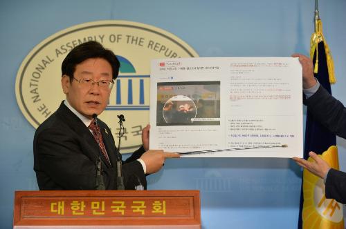 3일 오후 이재명 성남시장이 서울 여의도 국회 정론관에서 기자회견을 열고 최근 TV조선이 자신에 대해 악의적인 왜곡보도를 하고 있다며 형사고소와 정정보도 요청, 손해배상 청구 등 할 수 있는 모든 조치를 하겠다고 말했다. 사진/성남시청