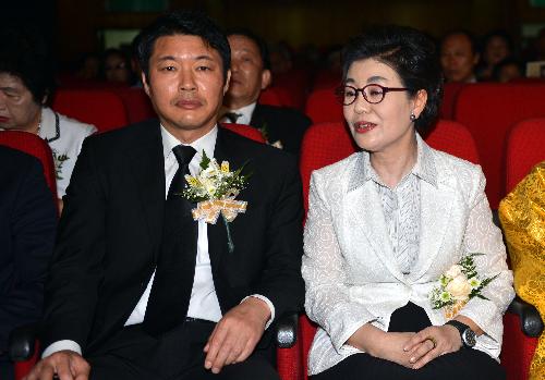 지난 2013년 6월21일 오후 광주 서구 서구문화센터 대강당에서 박정희 대통령·육영수여사 추모기념 및 한국불교동방조계종 호남지회 발대식이 열리고 있는 가운데 박근령 한국재난구호 총재(오른쪽)와 남편 신동욱씨가 추모제 참석해 나란히 앉아있다. 사진/뉴시스