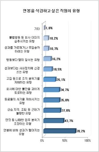 연봉을 삭감하고 싶은 직원의 유형 1위는 ▲‘연봉에 비해 성과가 떨어지는 유형’(70.2%, 복수응답)이었다. 다음으로 ▲‘딴짓 등 나태한 업무 분위기 조장하는 유형’(43.7%), ▲‘상습 지각, 조퇴 등 근태가 불량한 유형’(37%), ▲‘동료들의 사기를 저하시키는 유형’(35%), ▲‘회사에 대한 불만을 과하게 토로하는 유형’(34.7%), ▲‘고집 등으로 조직 분위기를 저해하는 유형’(26.1%), ▲‘성과보다는 사내정치에 신경 쓰는 유형’(18.5%), ▲‘행동보다 말이 앞서는 유형’(16.2%), ▲‘성과를 가로채거나 무임승차 하려는 유형’(10.7%), ▲‘불법행동 등 회사 이미지 실추시키는 유형’(10.2%) 등이 있었다.