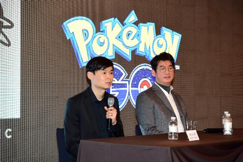 데니스 황 나이언틱 디자인총괄 이사(왼쪽)과 임재범 포켓몬코리아 대표가 24일 서울 조선호텔에서 열린 기자간담회에서 질문에 답하고 있다. 사진/나이언틱jpg