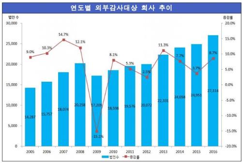 외부감사대상은 지난 2014년 외감법 개정에 따라 외부감사대상 자산총액이 100억원에서 120억원으로 상향되면서 주춤했지만 이후 회복되는 추세를 보였다.