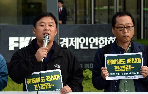 지난해 10월 서울 영등포구 여의도 전경련 회관 앞에서 열린 '전경련 해체 촉구 기자회견'에 참석한 안진걸 참여연대 공동사무처장이 발언을 하고 있다. 사진/뉴시스