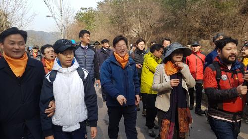 1일 오전 이재명 성남시장이 광주광역시 무등산 '노무현 길'을 오르며 시민들을 만났다. 사진/뉴스토마토