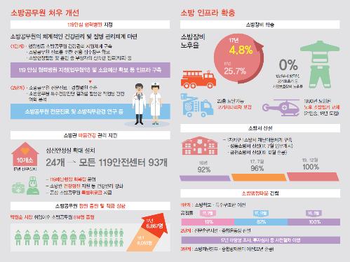 소방관 안전과 직결되는 개인보호장비 보급률은 2011년 78.1%에서 2016년 100%를 달성했다. 소방공무원 정원은 2012년부터 814명이 증원되면서 24시간 맞교대(2교대) 체제도 100% 3교대로 전환했다.