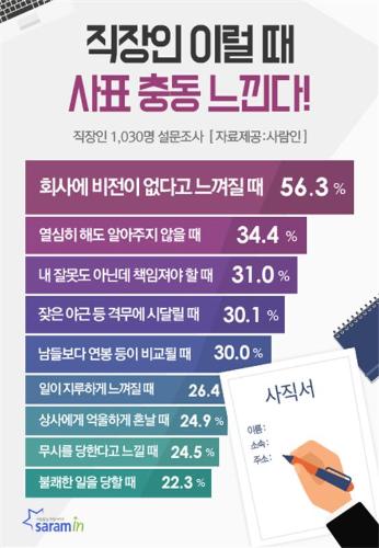 충동적으로 사표를 내고 싶은 상황 1위는 ‘회사에 비전이 없다고 느껴질 때’(56.3%, 복수응답)가 차지했다. 다음으로 ‘열심히 해도 아무도 알아주지 않을 때’(34.4%), ‘내 잘못도 아닌데 책임져야 할 때’(31%), ‘잦은 야근 등 격무에 시달릴 때’(30.1%), ‘남들보다 낮은 연봉 등이 비교될 때’(30%), ‘일이 지루하게 느껴질 때’(26.4%), ‘상사에게 억울하게 혼날 때’(24.9%), ‘무시를 당한다고 느낄 때’(24.5%), ‘욕설 등의 불쾌한 일을 당할 때’(22.3%), ‘과도한 성과를 요구 받을 때’(17.8%), ‘승진탈락 등 제대로 평가를 받지 못할 때’(15.6%) 등이 있었다.