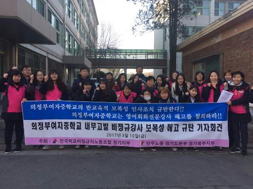 전국학교비정규직노동조합 경기지부와 민주노총 경기도본부 경기북부지부는 10일 오전 8시30분 의정부여자중학교에서 기자회견을 열고 "학교 측은 강사 A씨가 아이들을 위해 업무편람상의 활용을 요구하자 갑자기 올해부터 영어회화전문강사를 사용하지 않겠다며 A씨를 해고했다"고 주장했다.