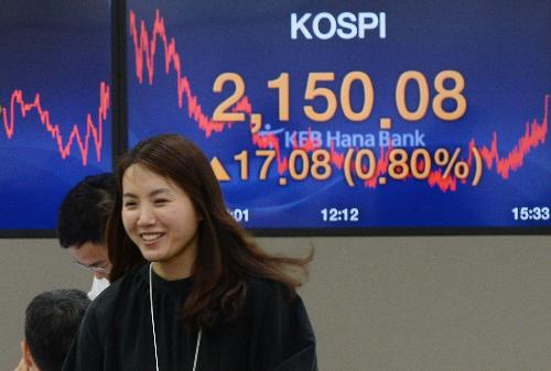 16일 한국거래소에 따르면 코스피는 전거래일보다 17.08p(0.80%) 오른 2150.08, 코스닥은 5.20p(0.85%) 상승한 613.88에 거래를 마감했다. 헌법재판소의 탄핵인용 결정 이후 정치 불확실성이 해소되면서 코스피는 9일 2091.06에서 상승세를 지속하면서 이날 2150선마저 돌파했다. 코스피가 종가 기준 2150선을 넘은 건 2015년 4월27일 이후 처음이다.