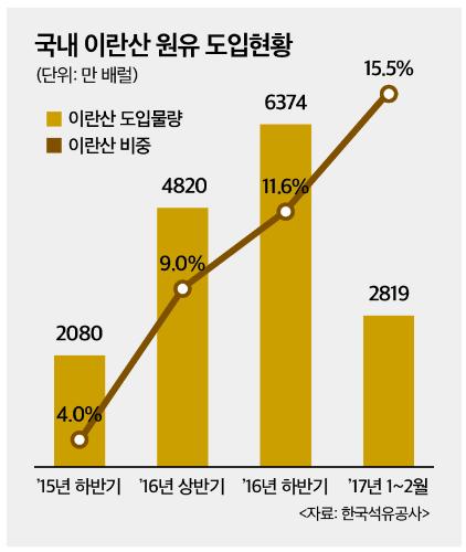 이란산 원유 도입 비중이 올해 들어 15.5%까지 가파르게 상승했다. 국내 정유·석유화학업계가 원가 경쟁력을 높이기 위해 원유 도입처 다각화에 집중한 결과다. 이란은 지난해 초부터 경제 제재가 풀리면서 다른 중동 국가보다 저렴한 가격에 원유를 공급하고 있다.