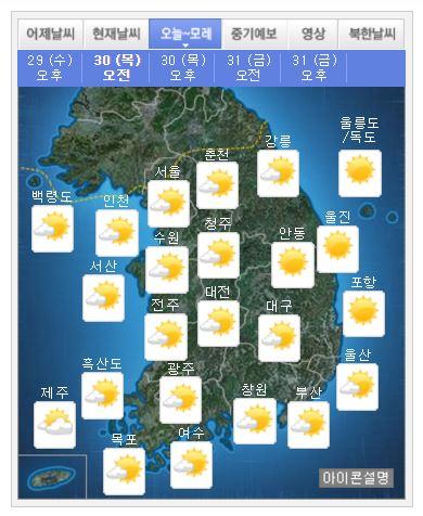 낮 예상 기온은 ▲서울 16도 ▲대전 18도 ▲대구 19도 ▲부산 18도 ▲광주 19도 ▲울산 18도 ▲포항 18도 ▲제주 14도 등이다.