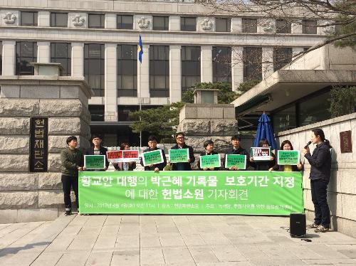 녹색당과 시민단체 '투명사회를 위한 정보공개센터'는 4일 서울 종로구 헌법재판소 앞에서 기자회견을 열고 "황 권한대행이 대통령 기록물의 확인, 목록작성 등 이관 절차를 수행할 수 있는 법적 근거가 없는 상황"이라고 비판하며 헌법소원을 청구한다고 밝혔다.