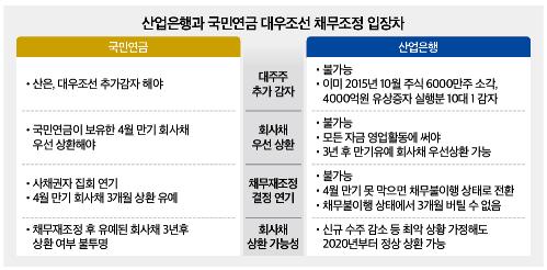 정부가 지난달 23일 대우조선 처리 방안을 발표한 이후 산은과 국민연금은 강 대 강 대치를 계속하고 있다. 앞서 산은은 삼정회계법인의 실사 결과를 바탕으로 국민연금을 비롯한 회사채 투자자들에 채권 1조3500억원 가운데 50%를 출자전환하고, 50%는 3년 상환 유예해줄 것을 요청했다.