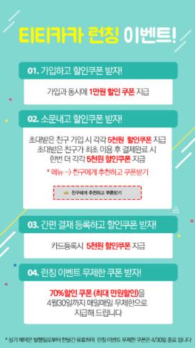 티티카카에 따르면 이달 말까지 진행하는 이번 이벤트는 신규가입 시 1만원이, 카드 등록 시 추가 5000원이 지급되며, 친구추천으로 가입하거나 친구추천 최초 완료 시 각각 5000원 쿠폰을 가입자와 친구 양쪽에서 제공받을 수 있다.