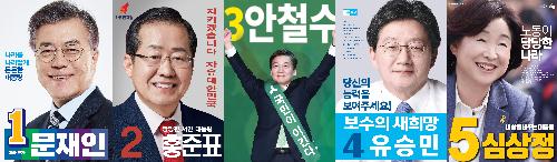 현재 판세는 더불어민주당 문재인 후보가 한 발 앞서가는 가운데 국민의당 안철수 후보가 맹추격하고 있고, 그 뒤를 자유한국당 홍준표·바른정당 유승민·정의당 심상정 후보 등이 따르며 반전을 노리는 구도다.
