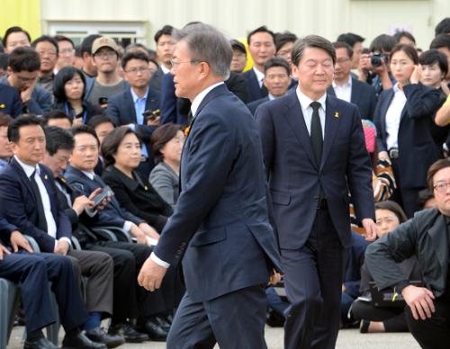 16일 오후 경기 안산 세월호 참사 희생자 정부합동분향소에서 열린 세월호 참사 3주기 기억식에서 추모사를 마친 문재인 더불어민주당 대선후보와 무대로 향하는 안철수 국민의당 후보가 각자의 길을 가고 있다. 사진/뉴시스