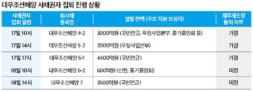 이달 18일까지 단 하나의 회차도 부결되지 않고, 채무 조정안이 통과되면 대우조선은 당장 이달 말부터 부족자금을 지원받아 유동성 위기를 넘길 수 있게 된다. 회사채 만기 도래액을 포함한 이달 말 대우조선의 부족자금은 9000억원이다.