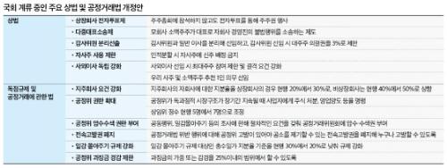 공정거래법 개정안 중에서는 지주회사 규제 법안이 최대 관심사다. 채이배 국민의당 의원이 발의한 개정안은 지주회사의 자회사에 대한 지분율을 상장회사의 경우 현행 20%에서 30%로 확대토록 했다. 비상장회사도 현행 40%에서 50%로 올렸다. 이 법안이 국회 본회의를 통과하면 대다수 재벌들은 비상이 걸린다. 지주회사 전환을 검토하고 있는 삼성과 SK, LG, GS, 한화, 두산, CJ, LS 등이 대상으로 거론된다.