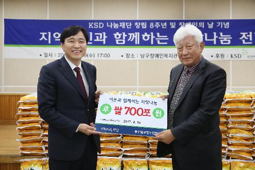 KSD나눔재단은 19일 부산 남구 장애인 복지관에 사랑의 쌀 1200포를 지원했다. 이번 행사는 부산지역 장애인이 운영하는 꿈이룸가게에서 구입해 부산 남구 장애인협회와 부산 시각장애인 복지연합회에 전달하는 것으로 취약계층의 자활과 자립을 지원하기 위해 마련됐다.