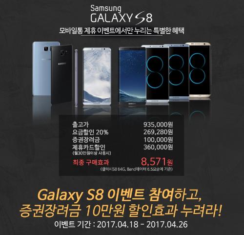 한편 갤럭시S8과 갤럭시S8+의 출고가는 각각 93만5000원, 99만원이며 6GB 램이 적용된 갤럭시S8+ 128GB 모델은 115만5000원이다. 이에 삼성전자 갤럭시S8를 시중가보다 싸게 구매할 수 있는 증권사 이벤트가 있어 화제가 되고 있다.