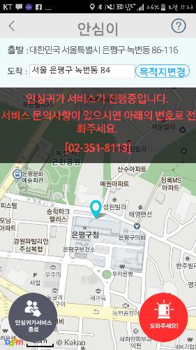 로그인 절차를 마치고 우선 안심귀가서비스 화면에 들어가니 하단에 지도 화면상이 내 위치가 뜨고 상단에는 목적지를 입력하도록 안내가 표시됐다. 왼쪽 하단 서비스 시작 아이콘을 누르자 지정한 보호자(기자는 본인을 설정)에게 “안심귀가 서비스를 시작하셨습니다 은평구 관제센터”라는 문자메시지가 전송됐다.