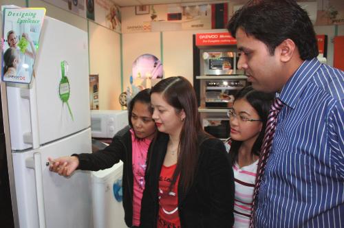 중동지역 소비자가 동부대우전자 자물쇠 냉장고를 구경하고 있다. 사진제공=동부대우전자