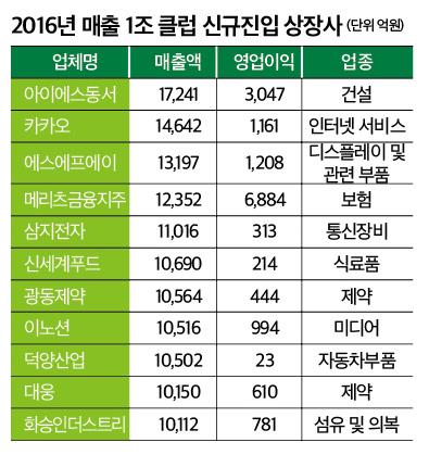 매출 규모별로는 아이에스동서가 1조7241억원으로 가장 많았다. 카카오 1조4642억원, 에스에프에이 1조3197억원, 메리츠금융지주 1조2352억원, 삼지전자 1조1016억원 순이었다. 신세계푸드 1조690억원, 광동제약 1조564억원, 이노션 1조516억원, 덕양산업 1조502억원, 대웅 1조150억원, 화승인더스트리 1조112억원 등도 1조 클럽에 이름을 올렸다.