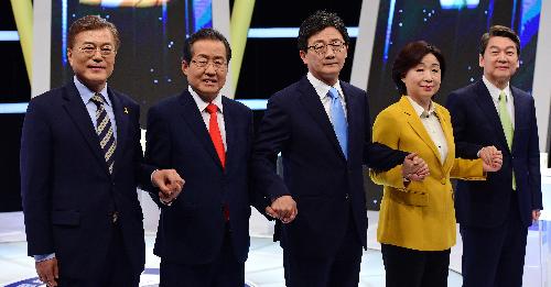 이번주 코스피는 대선 이후 경기 회복 기대감이 작용할 것으로 전망된다. 문재인 더불어민주당(왼쪽부터), 홍준표 자유한국당, 유승민 바른정당, 심상정 정의당, 안철수 국민의당 대선후보가 2일 서울 상암동 MBC 스튜디오에서 선거관리위원회 주최로 열린 마지막 TV토론에 앞서 포즈를 취하고 있다. 사진/뉴시스