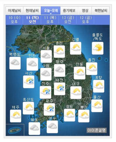 11일 기상청에 따르면 오늘은 충청남부와 전라, 경남, 경북서부내륙에 새벽부터 아침까지 비가 오겠다. 예상 강수량은 충청남부, 전라, 경남, 경북서부내륙 5~10㎜다.