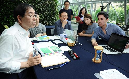 박원순 서울시장이 지난해 함께서울 정책박람회에서 정책을 제안한 시민들과 대화를 나누고 있다. 사진/서울시