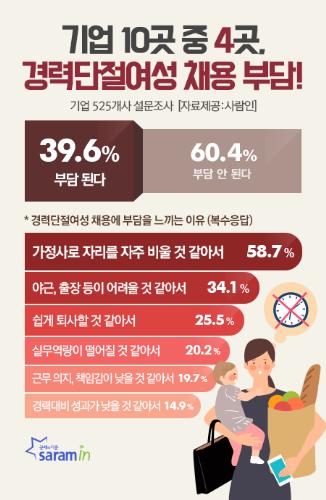 사람인이 15일 기업 525개사를 대상으로 ‘경력단절여성 채용 부담 여부'에 대해 조사한 결과, 이 중 39.6%가 ‘채용에 부담을 느낀다’라고 답했다. 이는 지난 2014년(29.1%) 조사대비 10.5%포인트 높아진 수치다.