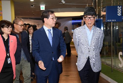 고은 시인과 박원순 서울시장이 16일 오후 서울도서관을 둘러보고 있다. 사진/서울시