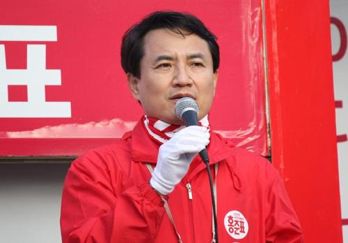 지난 7일 자유한국당 김진태 의원이 강원 태백시 황지동 황지자유시장 입구 삼거리에서 홍준표 대선 후보 지지를 호소하고 있다. 사진/뉴시스