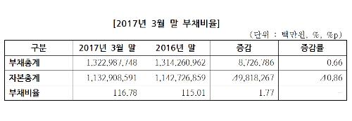 2017년 3월말 기준, 부채비율. 자료/한국거래소
