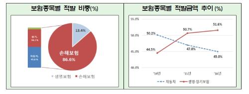블랙박스, CCTV 설치 등에 따른 보험사기 예방 효과로 자동차보험 보험사기 비중은 45.0%로 역대 최저 수준으로 감소했다. 자동차보험 사기 비중은 2013년 54.4%에서 2014년 50.2%로 감소 한 뒤 2015년에는 47%로 감소했다.
