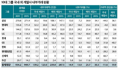 29일 공정거래위원회와 재벌닷컴 등에 따르면, 총수 일가가 있는 10대그룹(2017년 공정자산 기준, 포스코·KT는 제외)의 국내외 계열사에 대한 내부거래는 2011년 379조원에서 2015년 410조5000억원으로, 4년새 31조5000억원(8.51%) 증가했다. 국내 계열사에 대한 내부거래는 16조2000억원(11.6%) 감소했으나, 해외 계열사 내부거래가 47조7000억원(19.9%) 크게 늘었다.