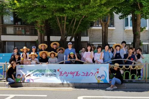 이번 벽화 봉사에는 40여 명의 사람인 HR 임직원들과 구로구 자원봉사센터 담당자들이 참여해 초여름 땡볕 아래 구슬땀을 흘렸다. 벽화 그리기에는 다소 불편한 조건의 좁은 공간이었지만, 임직원들의 적극적인 참여로 이틀에 걸쳐 벽화를 완성했다.