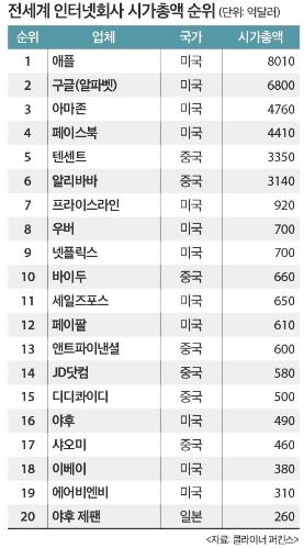 애플과 구글(알파벳), 아마존, 페이스북, 프라이스라인, 우버, 넷플릭스 등 미국 회사 12곳이 20위권에 포진하며 중국의 위협을 이겨내고 아성을 지켰다. 미국과 중국을 제외한 나머지 1곳은 일본의 야후재팬이다.