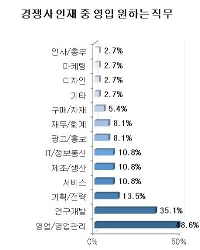 가장 영입을 원하는 직무는 ‘영업/영업관리’(48.6%, 복수응답)였다. 계속해서 ‘연구개발’(35.1%), ‘기획/전략’(13.5%), ‘서비스’(10.8%), ‘제조/생산’(10.8%), ‘IT/정보통신’(10.8%), ‘광고/홍보’(8.1%) 등의 순이었다.
