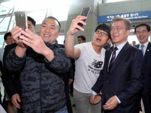 문재인 대통령이 지난 달 12일 인천공항공사에서 열린 '찾아가는 대통령, 공공부문 비정규직 제로시대를 열겠습니다!' 행사에 참석 중 출국자들과 기념촬영을 하고 있다. 사진/뉴시스