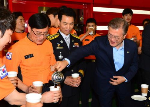 문재인 대통령이 7일 오전 일자리 추경 현장 방문 일환으로 서울 용산소방서를 찾아 차담회를 위해 소방대원들에게 커피를 따라주고 있다. 사진/뉴시스