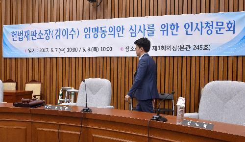 김이수 헌법재판소장 후보자 인사청문경과보고서 채택이 불발된 지난 9일 오전 서울 여의도 국회 제3회의장에서 관계자들이 회의장을 정리하고 있다. 사진/뉴시스